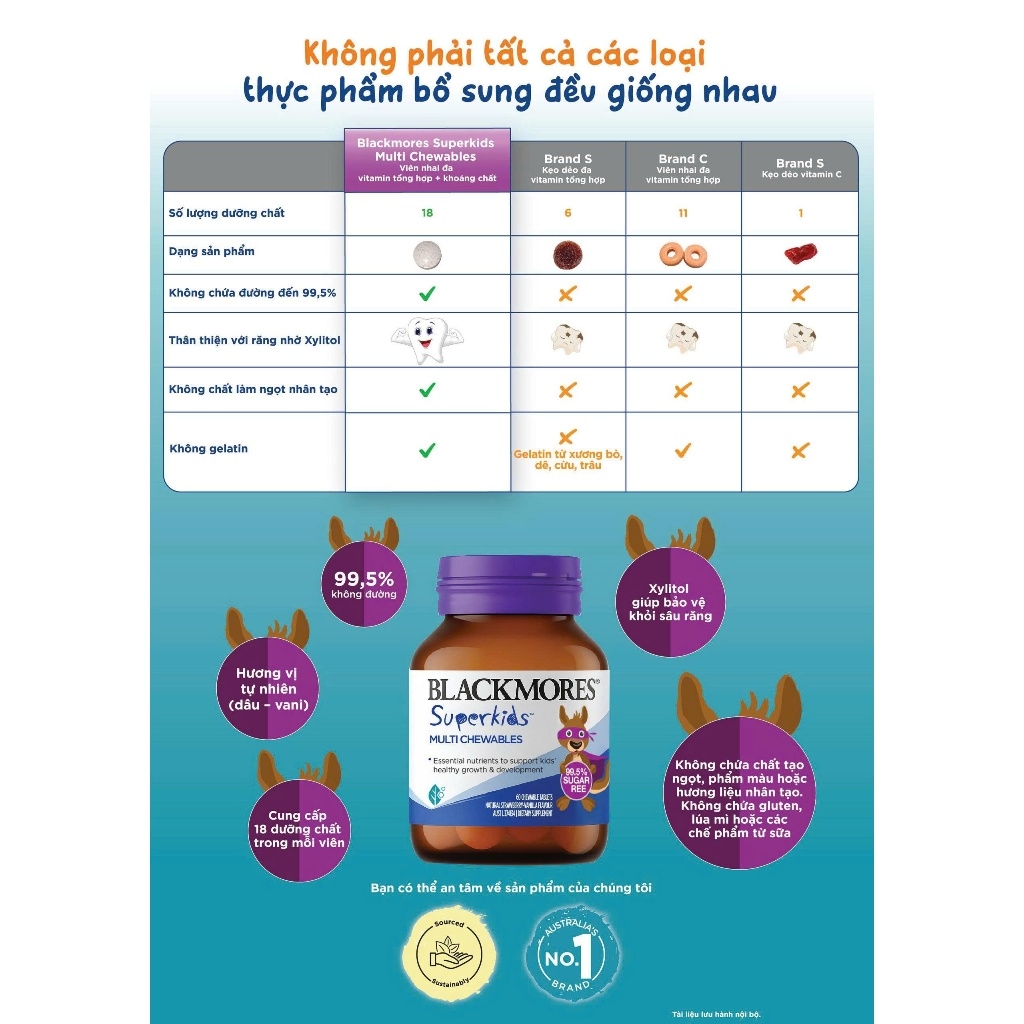 Blackmores Superkids Multi Chewables cũng không có hương vị và màu sắc nhân tạo.