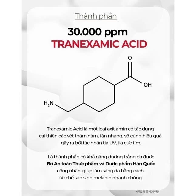 - Tranexamic Acid 30,000ppm: Hoạt chất giúp ức chế sự hình thành melanin, làm mờ thâm nám, tàn nhang, đồi mồi hiệu quả.